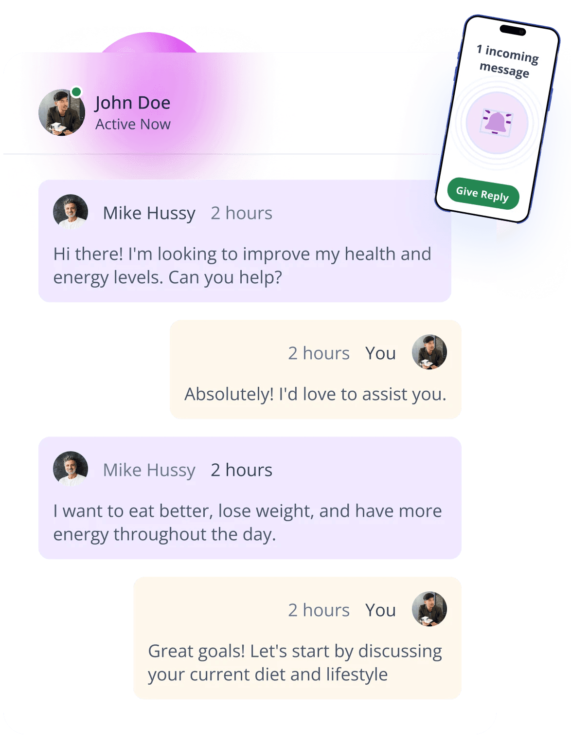 Send tailored recommendations and meal plans directly to your clients' devices, fostering safe communication and achieving better results together.